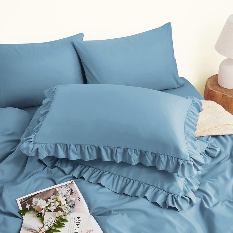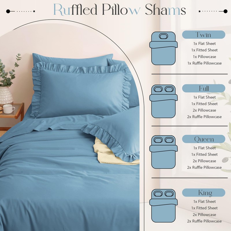 - [Farmhouse Aesthetic] - Our 6-piece king sheet set including 1x flat sheet(102" x 105") + 1x fitted sheet(80" x 78") + 2x pillowcases(20" x 36") + 2 ruffled pillow covers(20" x 36"). Vintage-inspired ruffle trim with solid color design, creates elegant cottage atmosphere.
