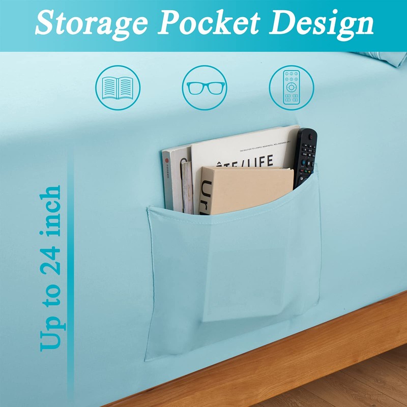 Design - Storage pocket on the side makes it storage easily small objects. Pure color bed sheet set blends easily with any decor, everthing is just right.