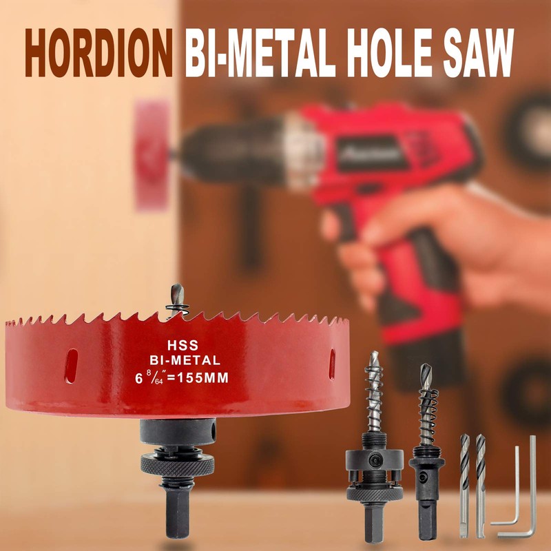 Hordion 155mm 6.1 inch Hole Saw with Drill Bits & Arbor, Heavy Duty Bi-Metal Hole Cutter for Cornhole Boards Wood Plastic Drywall