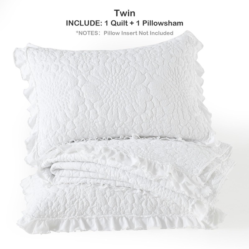 HORIMOTE HOME White Ruffled Quilt Twin Size, Stone-Washed Microfiber Lightweight Crinkled Farmhouse Rustic Shabby Chic Bedding Set, 2 Pieces Reversible Bedspread with Pillow Sham for All Season