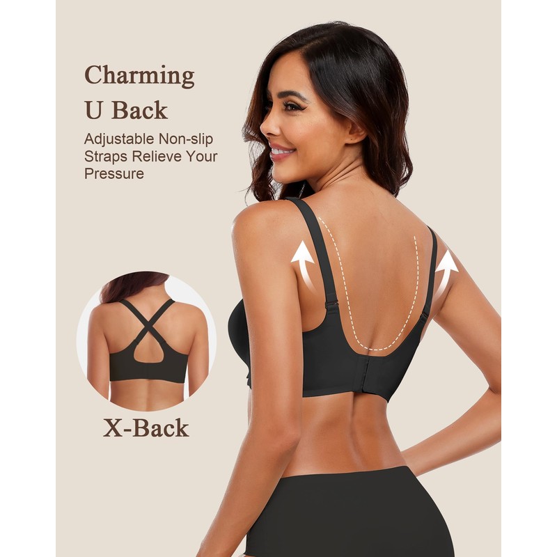 - Two Ways to Wear for Back:HORISUN seamless t shirt bra designed with X-shaped straps wearing style can lift your breasts and back, which are sturdy and durable.U-shaped straps wearing style can make your shoulders more relaxed with highly elastic straps. The invisibale comfortable back buckles design hides well under any of your clothes.
