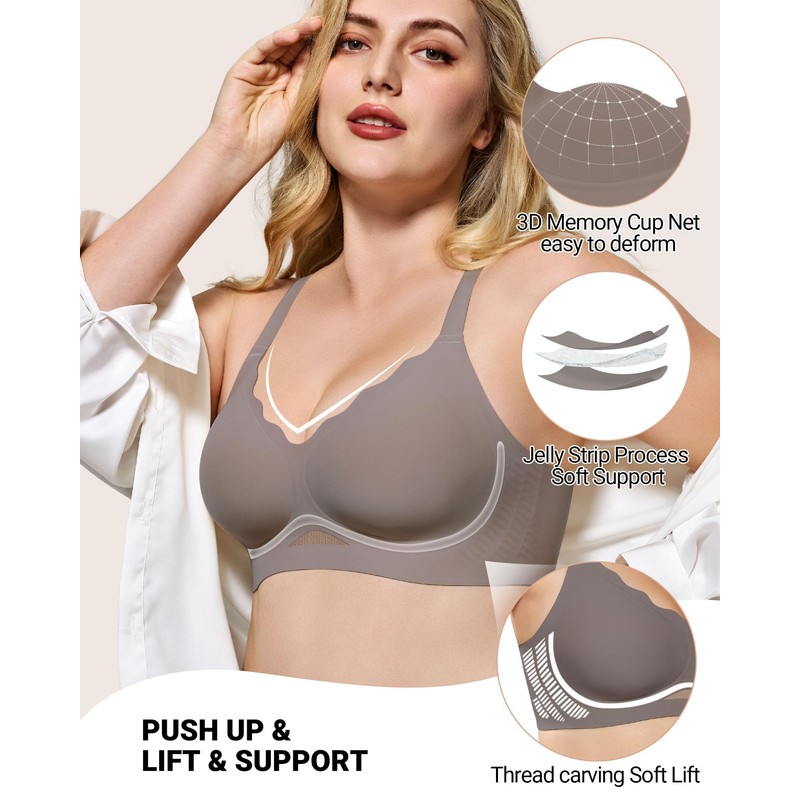 Updated Wireless Push-Up & Perfect Support: Forget uncomfortable wires! Our innovative design features liquid jelly strips forming a unique "W-shaped" and 3D supportive structure. This technology provides full, secure support, creating a naturally fuller, lifted chest shape while effectively smoothing and concealing side fat for a flawless silhouette.