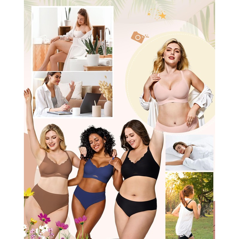 - 【Scalloped V Neck & Breathable Mesh Triangle Bras】 - Our no underwire bra is decorated with a scalloped V-neck design to ensure a smooth transition and reduce visible lines under clothing. The hem of the seamless bra is detailed with triangular mesh fabric. It allows for increased airflow,ensuring maximum comfort and freshness throughout the day