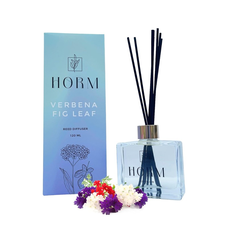 HORM Botella difusor de varillas (120 ml) con ricos palitos de hierbas perfumados 'Verbena Fig Leaf' aroma ajustable, fácil de usar, decoración elegante, ideal para el hogar, baño, cocina, oficina