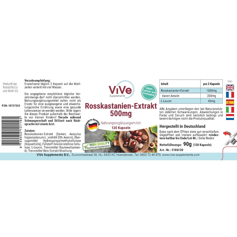 - ✔ Excellent value for money: Standardized horse chestnut extract from ViVe Supplements. The daily consumption of 2 capsules provides 1000 mg of horse chestnut extract, of which 200 mg Aescin. High dose. Regular intake: Adults 2 capsules daily spread over meals with plenty of water.