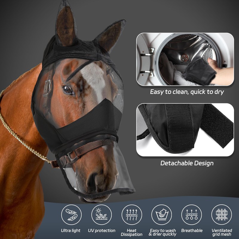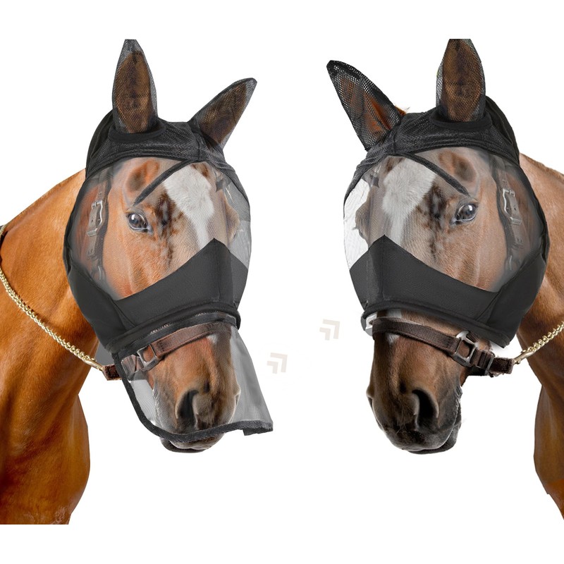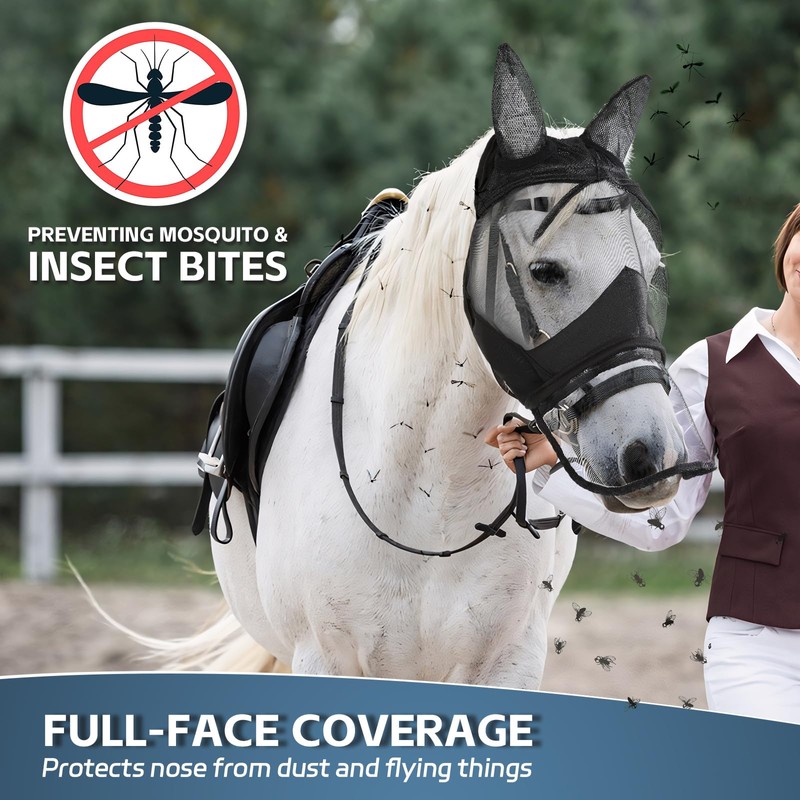 - 1.FULL FACE PROTECT;This fly mask has it all -- full face protect including extended nose and ear protection.No more aggravating and highly irritating flying problems for your horse!