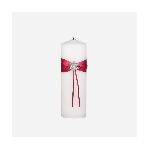 - White candle decorated by a shimmering rose satin sash and silver-tone adornment with faux pearl accent