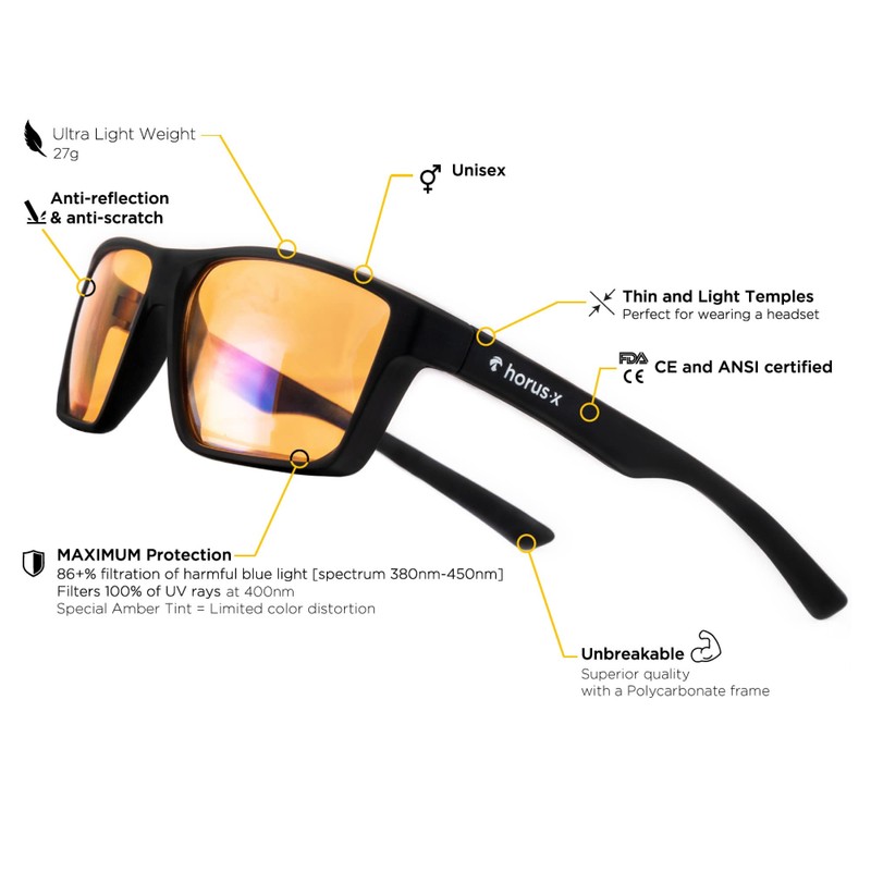 Horus X • Blue Light Blocking Gaming Glasses - Professional Screen Filter Anti Glare Fatigue and Eyestrain (Games, TV, PC) - eSport Men and Women - Amber