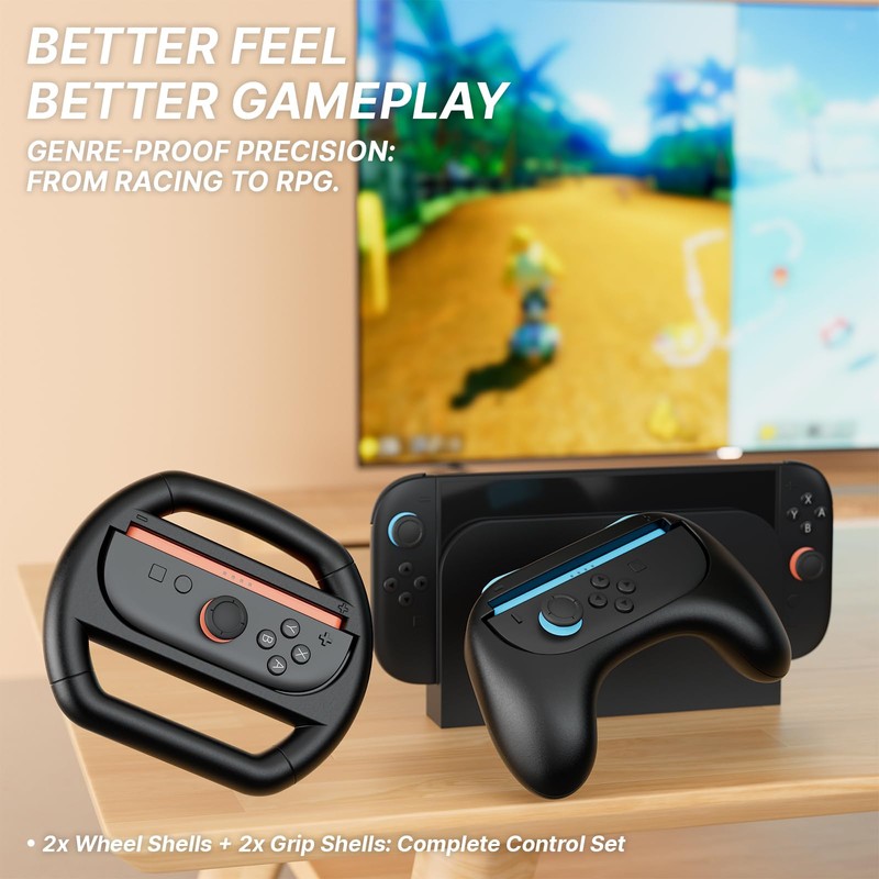 • 【2-in-1 Multi-Function Design】 Seamlessly switch between ​Racing Wheel Mode (Perfect for karting games) and an ​ergonomic JoyCons Grip Mode (ideal for action games)—one kit adapts to every gaming style. No more messy accessories. Dominate racing, sports, and RPGs with a single pro-level tool.