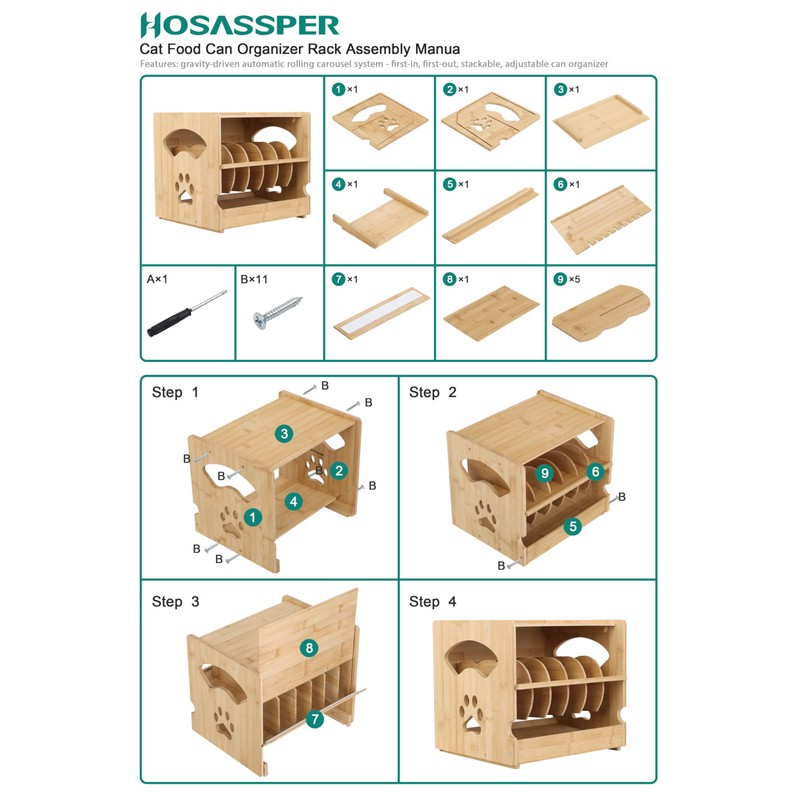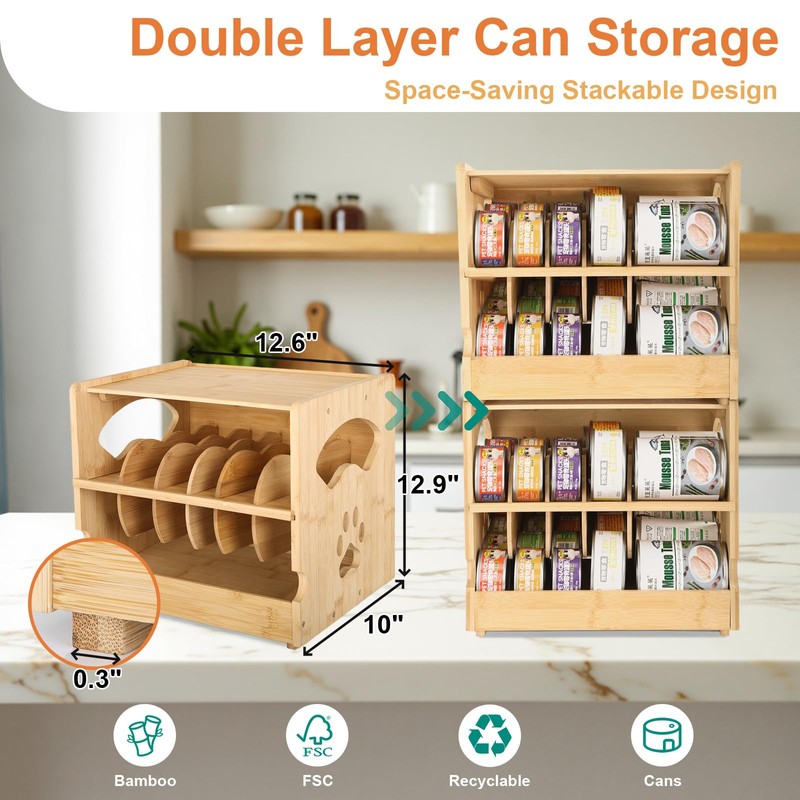 HOSASSPER Bamboo Cat Food Can Organizer. Upgraded 2-tier stackable design Holds 42 (3oz) cans. Perfect for pantry/kitchen Durable & space-saving pet food storage rack (Small)