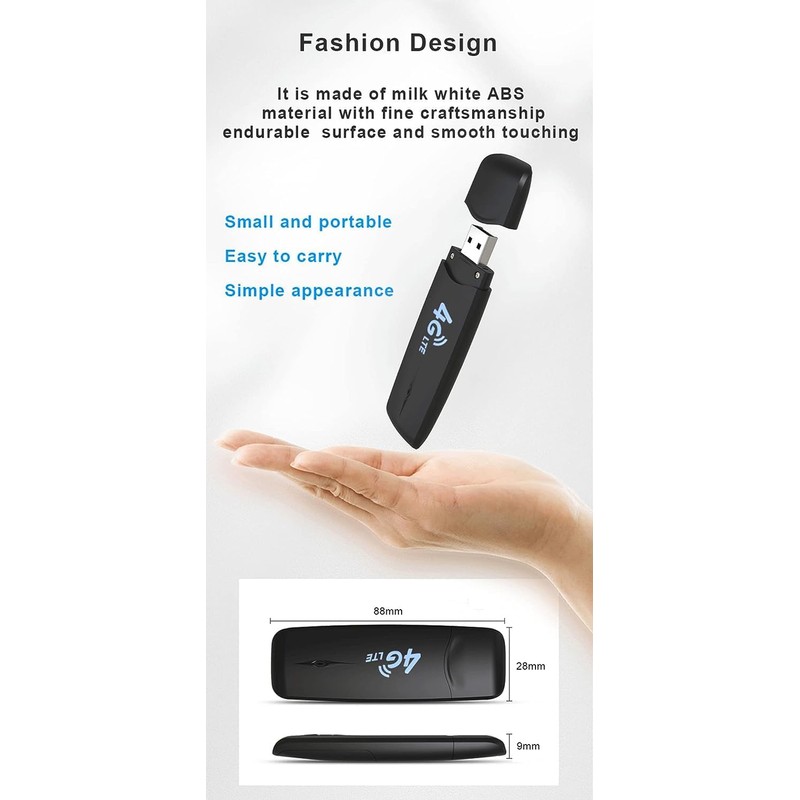 - High Speed 4G LTE Chipsatz, Unterstützung TDD-LTE/FDD-LTE/UMTS/Netzwerke; Unterstützung von 10-WLAN-Nutzern; Mehrsprachig; Plug-Play, einfach zu bedienen; Super winziger 4G USB Dongle, innovative Nano SIM-in-USB Technologie; Schließen Sie die USB-Ports des Windows-Computers an, um als USB-Modem zu arbeiten; Netzteil: 5V1A USB-Stromversorgung Gerätegröße: 87mm x 28mm x 12mm