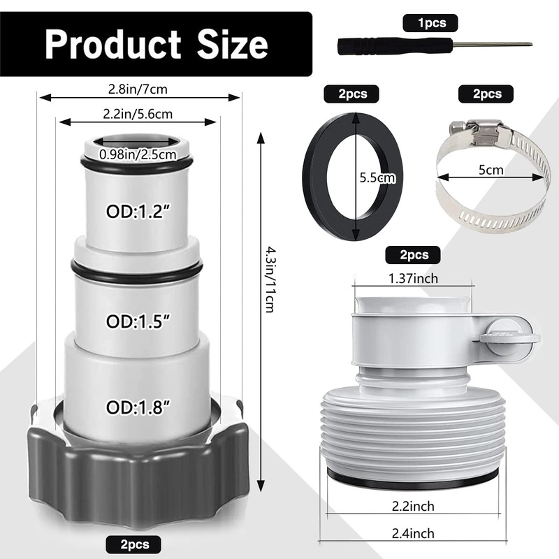 - Pool hose adapter kit: 2 pack pool adapters, enough to use or replace them in your daily life. 2 hose clamps and 2 gel pads, 1 small screwdriver for a more waterproof connection.