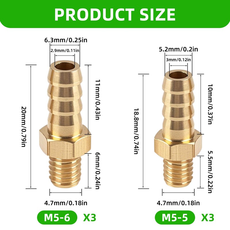 Hose Connector Brass M5 x 0.8-5 mm and M5 x 0.8-6 mm, Pack of 6 Brass Hose Connector with Barbs, Leak-proof Hose Connector for Irrigation, Swimming Pool and Industrial Applications
