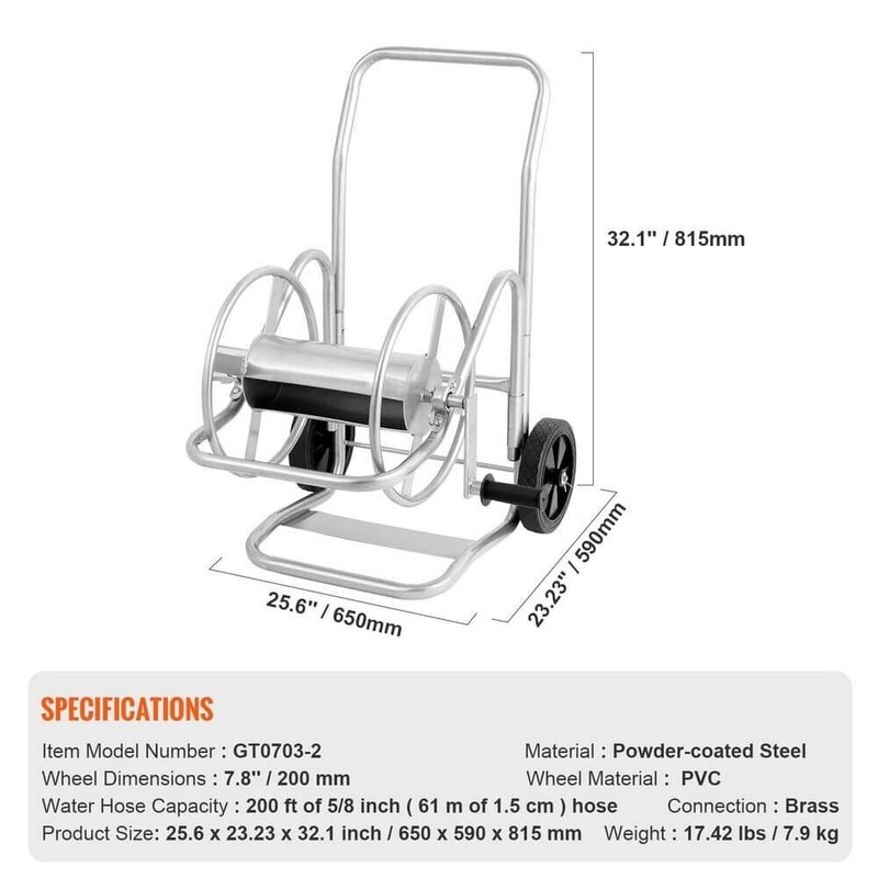 SVOPES Hose Reel Cart - The Essential Tool for Effortless Gardening. Transform Your Garden Experience with Ease. Introducing the SVOPES 200 ft. hose reel cart designed to handle hoses up to 5/8 in. thickness. Made from durable steel, it's built to withstand tough weather conditions while helping you water your garden without hassle. The convenient crank handle makes hose retraction quick and simple, eliminating the frustration of tangled hoses and making outdoor chores a breeze. Large Hose Capacity, Heavy-Duty Steel Construction, Detachable Frame for Easy Storage, Stable Mobility for Easy Movement.