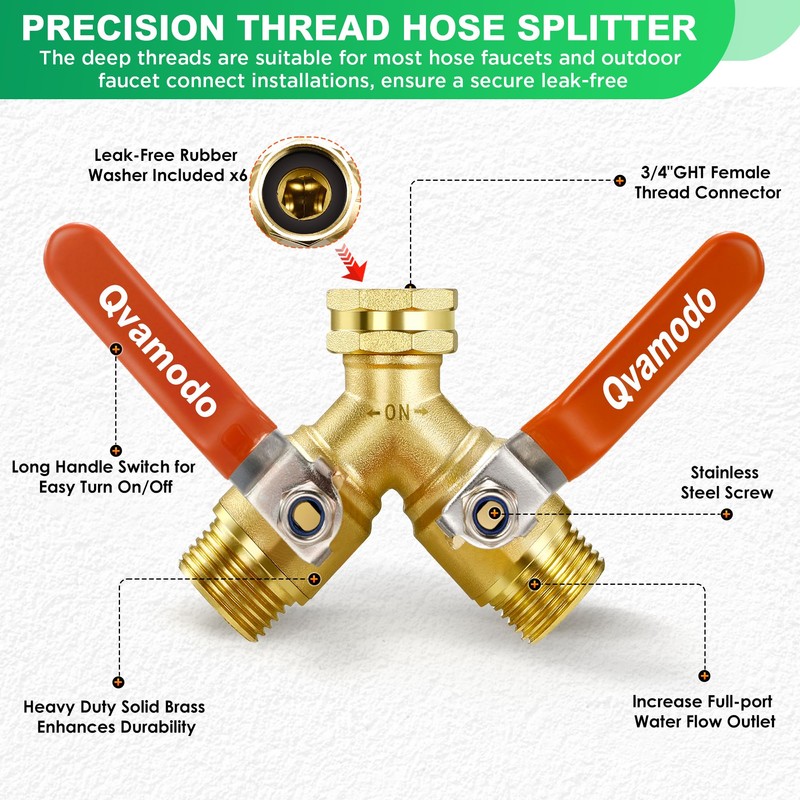 - 【Precision Thread Compatible with All Standard Faucet & Garden Hoses】Our Qvamodo hose splitter 2 way equipped with an easy-turn swivel connector, it easily attaches to all North American standard 3/4-inch taps or hose connections. Suitable for various applications including standard garden hoses, watering devices, automatic watering systems, RVs, drip irrigation, washing machines, faucets, lawn sprinklers, water nozzles, and dishwashers.