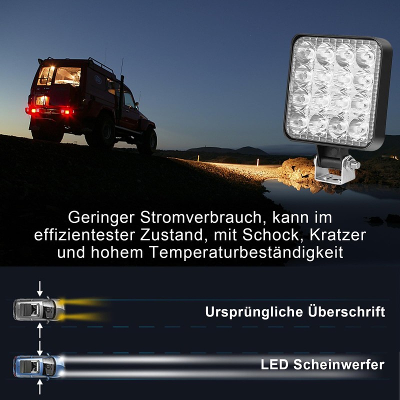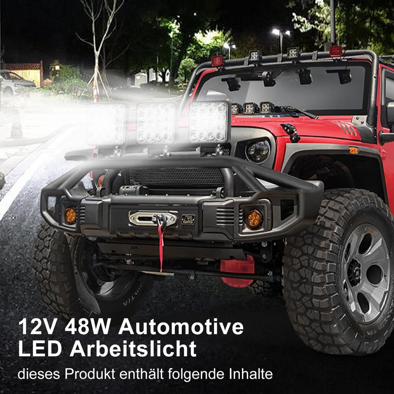 - Powerful lighting – the 12 V car LED work light has an impressive power of 48 watts with 16 high-intensity LED bulbs. This ensures excellent lighting and improves visibility on the road during night rides, which increases road safety. This LED work light is not only suitable as a driving assistance, but also as an ideal choice for the individual redesign of the front light to give your vehicle a powerful look.