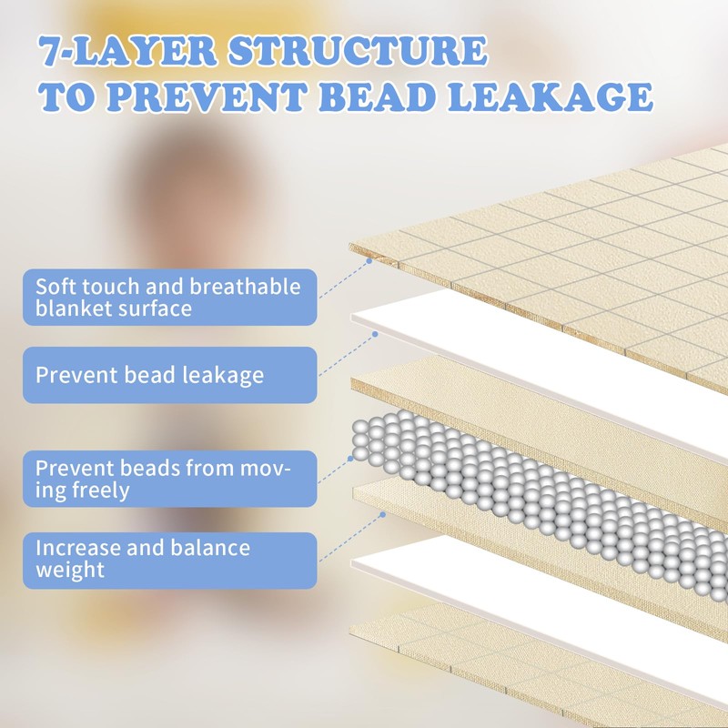 - Craftsmanship: This weighted blanket is made of 100% microfiber, soft and breathable; The 7-layer structure and strong stitching prevent the glass beads from missing or moving freely when the weighted blanket is used; The weighted blanket can be fixed on various quilt covers through four corners of the loops