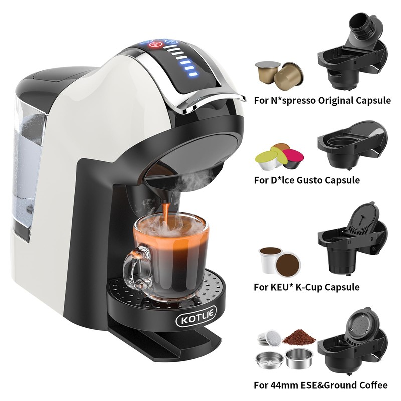 - Multicapsule 5in1 Coffee Machine: 19 Bar Presssure; 1400W Fast-heating boiler. Kotlie Espresso Coffee Maker’s pods are suitable for K*eurig K*cup capsules/D*olce G*usto capsules/N*es Original capsules/Ground Coffee/44mm ESE. This makes to easy to brew kinds of flavors of coffee with rich crema very quickly