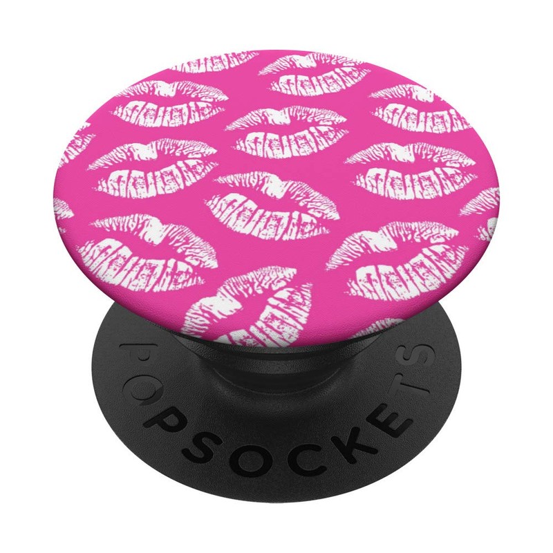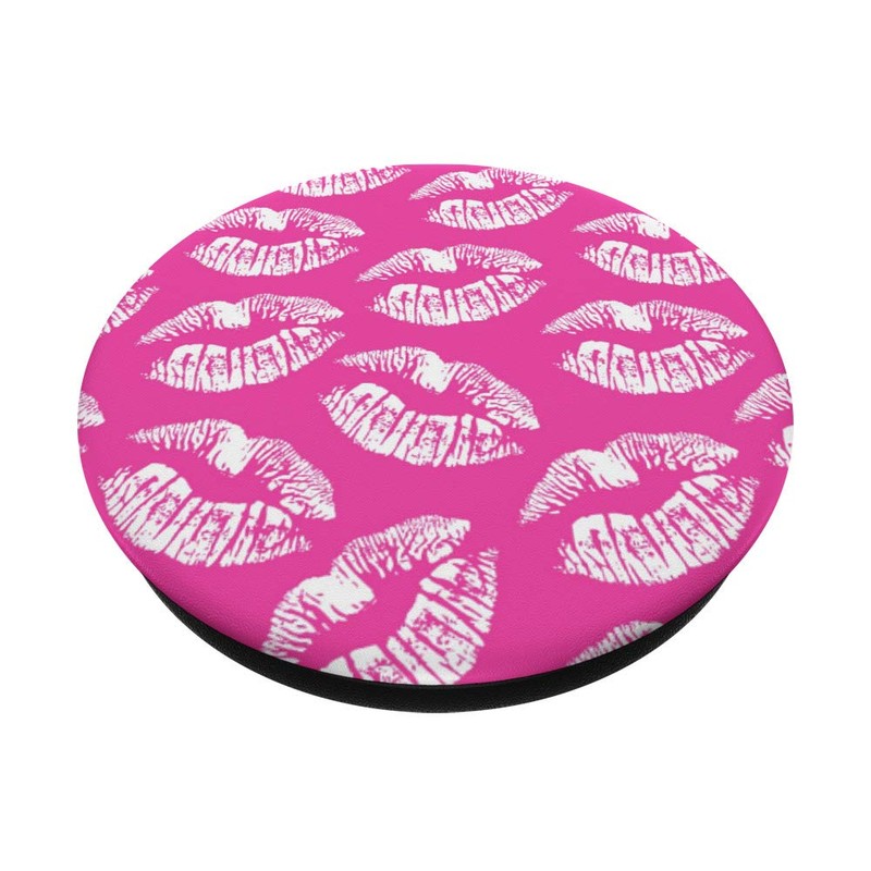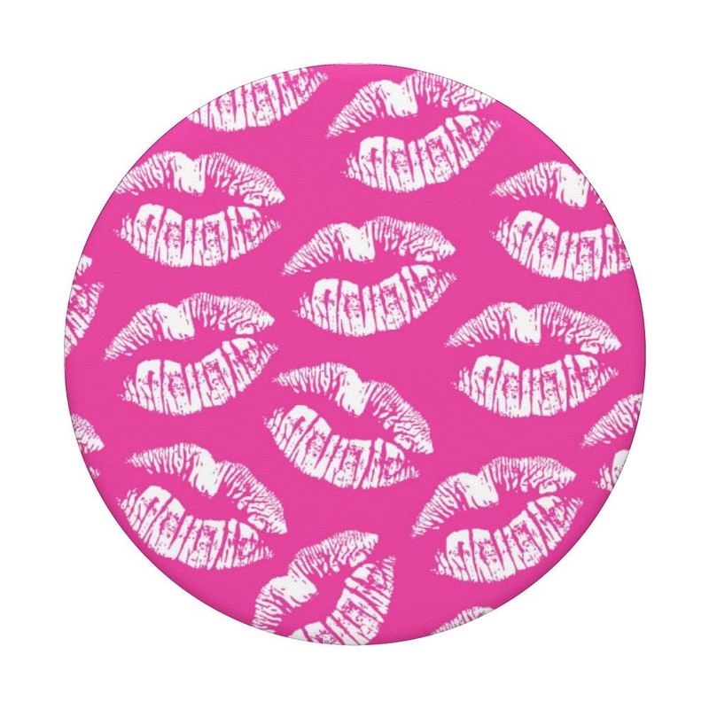 • Features a pattern of white open mouth lipstick kisses on a dark pink background.
