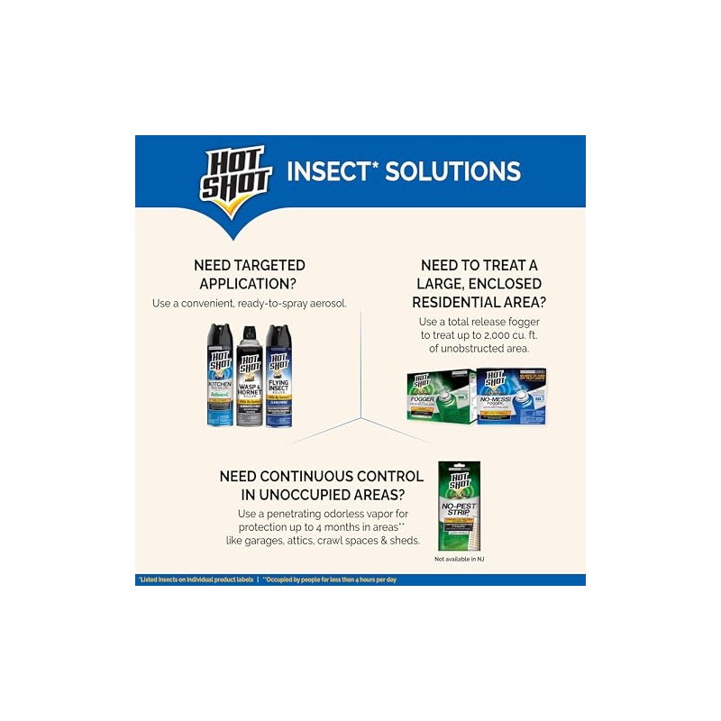 Between the carpool and the couch cushions, you're the CEO of the home front. Take care of your family C and take care of business, no matter where household pests rear their ugly heads. Show bugs who's boss with Hot Shot insecticides. They're your weapon of choice, giving you the clear advantage within your walls and at the bank. Save the day.Hot Shot Fogger6 With Odor Neutralizer creates a ?ne, penetrating mist that reaches deep into cracks and crevices to ?ush out and kill hidden bugs on contact. This product kills ants (except fire ants), black carpet beetles, brown dog ticks, crickets, earwigs, firebrats, fleas, flies, gnats, houseflies, mosquitoes, palmetto bugs, pillbugs, rice weevils, roaches, saw toothed grain beetles, silverfish, small flying moths, spiders and waterbugs. Does not control bed bugs. When used as directed, the clear, non-staining formula will not harm drapes, upholstery, fabrics, carpeting, bedspreads, ?oor tiles, wood ?oors, linens, furniture, walls, clothing, ceilings, shades or blinds.Hot Shot Fogger6 With Odor Neutralizer kills both ?ying and crawling insects on contact and keeps killing for up to 2 months without leaving a wet residue. One can of this product treats up to 2,000 cubic feet of unobstructed space. Read and follow all label directions before using this product. When creepy bugs attempt to pass, save the day with Hot Shot insecticides.