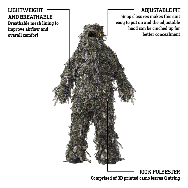 - BREATHABLE: Our Ghillie suit has a heavyweight design with generous airflow. This suit is comprised of both the hooded jacket and pants, both lined with breathable mesh lining to improve airflow and overall comfort. Storage bag included.