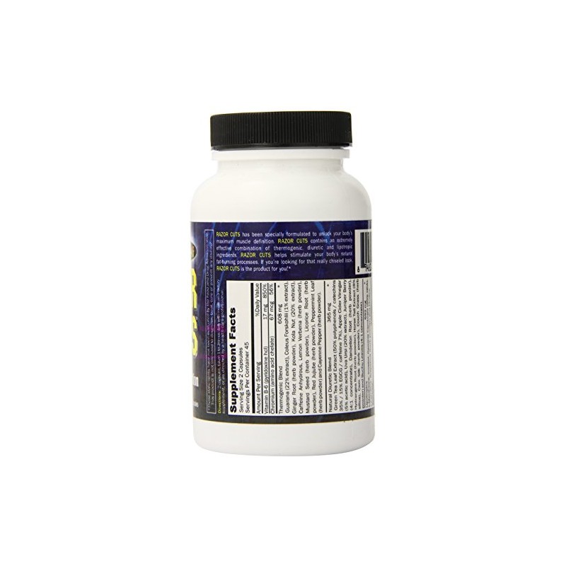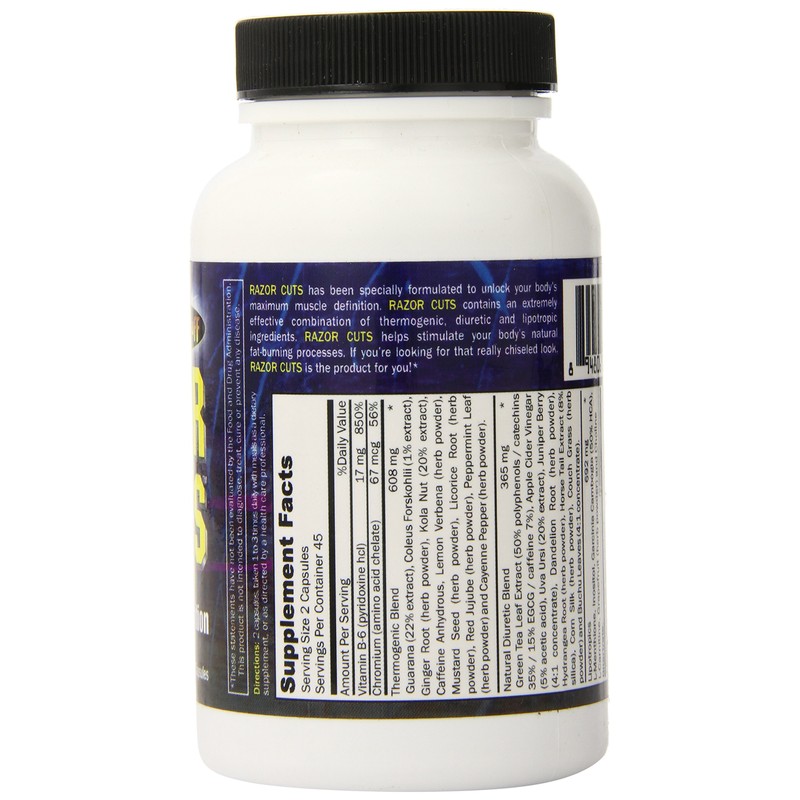 Razor Cuts has been specially formulated to unlock your body's maximum muscle definition. Razor Cuts contains an extremely effective combination of energy, thermogenic, diuretic and lipotropic ingredients, all in one comprehensive formula. No other product on the market delivers this kind of punch. Each ingredient in Razor Cuts has been put in its proper proportion to help stimulate your body's own natural fat burning process. So if you're looking for that really chiseled look, razor Cuts is the product for you.