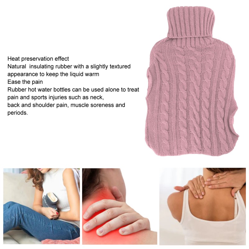 1、For Pain Relief: Rubber hot water bags can be used alone to treat pain and sports injuries such as neck, back and shoulder pain, muscle soreness and menstrual cramps. 2、Wide Mouth: Easy to fill with hot water, anti jet lip prevents water from spitting out, can only fill 2/3 of the capacity at most, please make sure the hot water temperature does not exceed 80℃ before pouring. 3、Knitted Cover: Soft and cuddly knitted water bottle cover with removable knitted cover helps insulate hot water and keep it effective for 6‑8 hours. 4、Insulation Effect: Hot water bottles are made of natural premium insulated rubber with a slightly textured appearance to maintain the temperature of the liquid. 5、Machine Washable Cover: This hot water bag cover can be washed, washable in a washing machine, not easy to damage, convenient and practical.