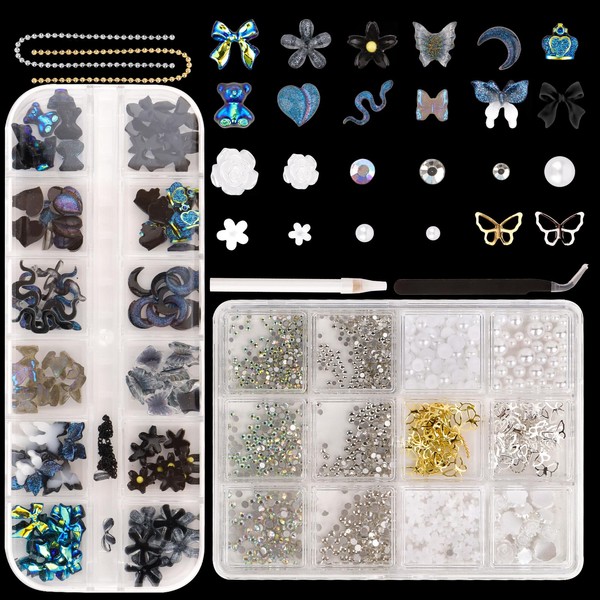 - Nail Charms with Free Tools: Gothic nail charms, pearl nail charms, and nail rhinestones come in two themed boxes. Box 1 has silver/white resin charms like pearls, flowers, metallic butterflies, and chains. Box 2 offers dark/aurora nail gems with gothic designs (bows, snakes, bears). Both boxes include 12 compartments + tweezers & dotting pen. Nail charms and gems stay organized for themed manicures; mix silver pearls with chains or pair black butterfly charms with moon gems.