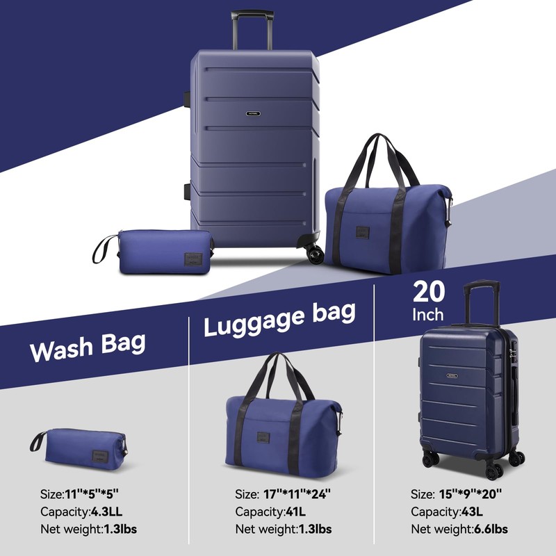 - [Versatile 3-Piece Travel Set] Luggage sets 3 piece features a expandable 20 inch carry on luggage, a matching duffle bag, and a toiletry bag. The carry-on expands up to 20% while complying with airline size requirements, making it ideal for short trips. Enhanced with a TSA-approved lock, ensuring smooth security clearance and safeguarding your belongings.