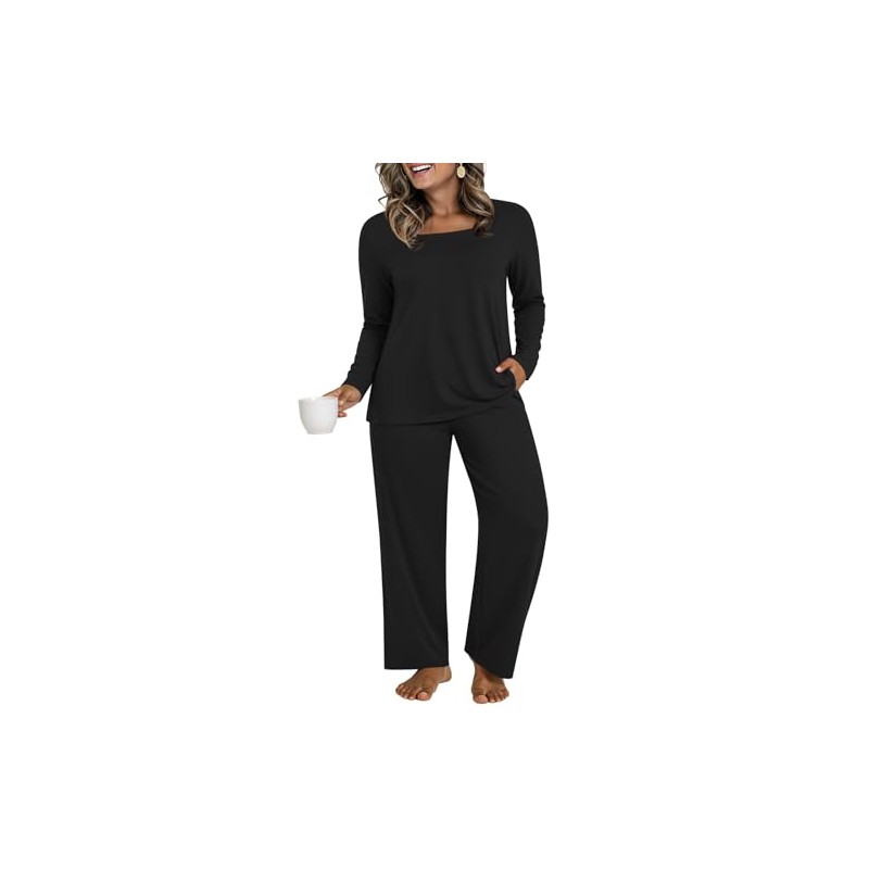 HOTGIFT Plus Size Womens Pajama Sets Winter Pjs Loungewear Sleepwear 2 Piece with Pockets Black X-Large