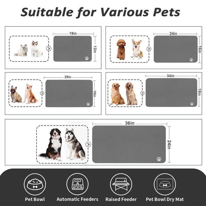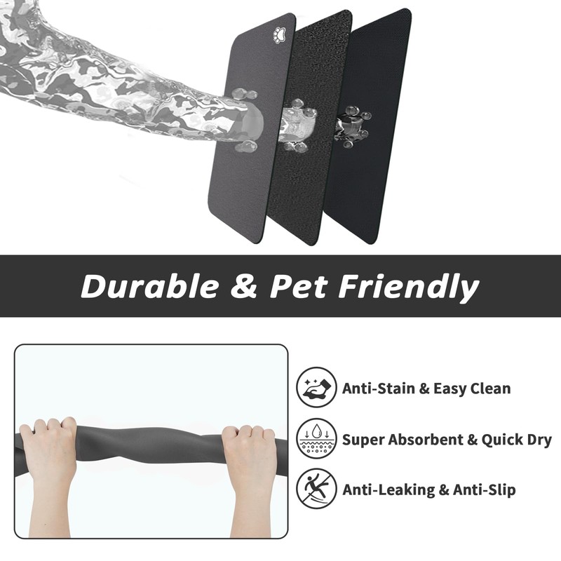 - 【Super Absorbent & No Stains】The magical water absorption material can capture every drop of water around pet water or food bowl, as well as every drop of water dripping on the pet chin. Special PU material can hide water, coffee, milk and other stains well, allowing you to bid farewell to the traditional pet feeding mat that is full of stains and messy.