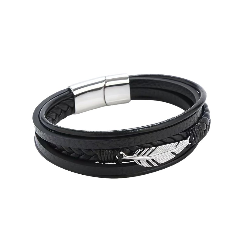 HOTMYIDA Mens Leather Bracelet with Clasp Multi-Layer Braided Men Wrist Jewelry Feather Cuff Bracelet M-009
