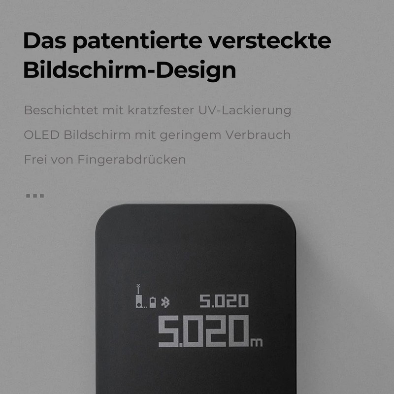 - What you can do - ①. iF Design Award 2022 & Good Design Award 2021. ②. Patented index finger ring design. ③.Bluetooth connection to smartphone. ④. Measuring range: 30 m, high accuracy ± 2 mm. ⑤.Hidden OLED display ⑥.USB-C Charging 7. User-friendly operation. 1. German user manual.