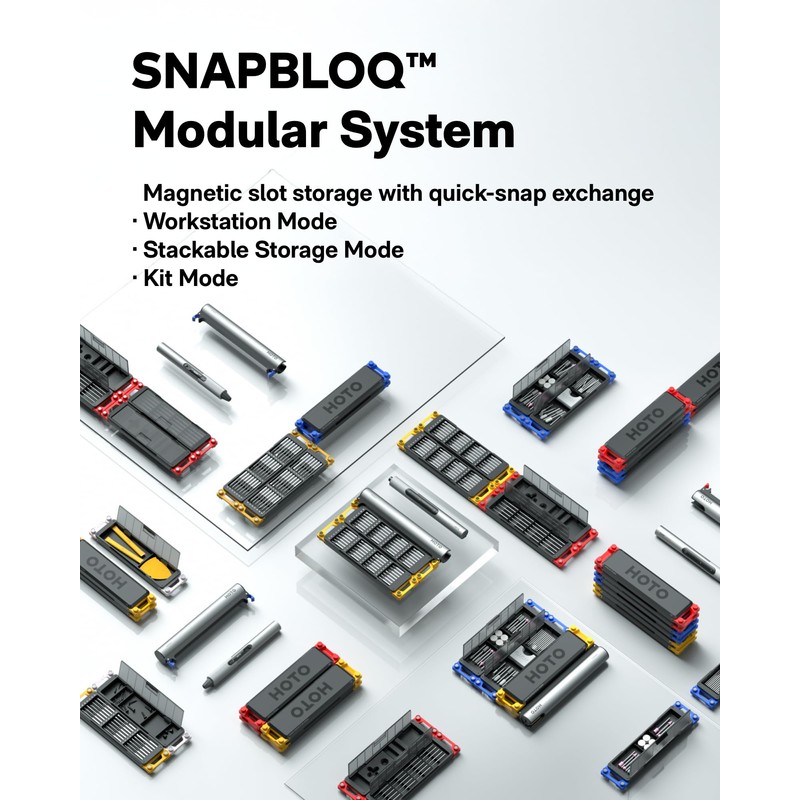 - SnapBloq Modular Ecosystem: Transform your toolkit in seconds by switching between Workstation, Storage, and Portable modes via magnetic quick-release connections. The future-ready design lets you start with a precision screwdriver today and expand into a full micro-workshop tomorrow. In an era of rapid innovation, we craft tools that blend practicality with creativity – embodying our philosophy: “MAKE YOUR CREATION A TREASURE”