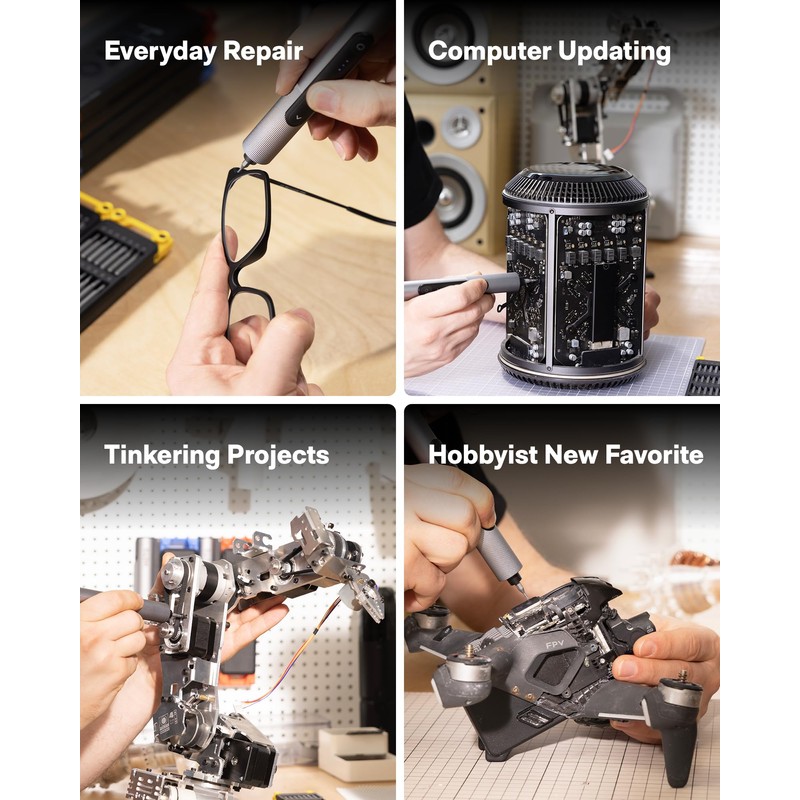 - Engineer-Approved Ergonomics: Redefine DIY comfort with a textured non-slip grip engineered to reduce hand fatigue. The compact portable mode magnetically stores all 56 bits – your all-in-one tool for electronics repairs, RC models, computer upgrades, or tinkering projects. Keep your workspace organized with magnetic storage mode, or transform any surface into a repair hub with workstation mode