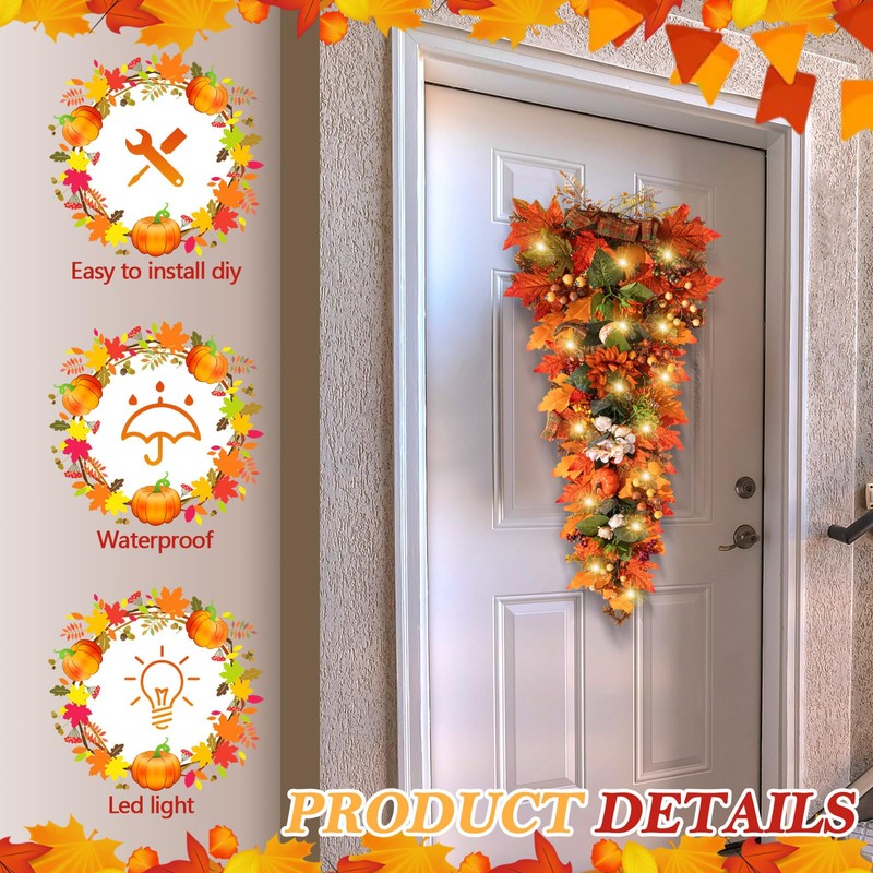 - Illuminate Your Autumn Evenings: witness the warm glow of the Thanksgiving teardrop wreath that comes equipped with warm white LED lights; Powered by 2 AA batteries (not included), it casts a comforting and enchanting glow whenever darkness falls, illuminating your home and keeping you company throughout the long harvest festival nights