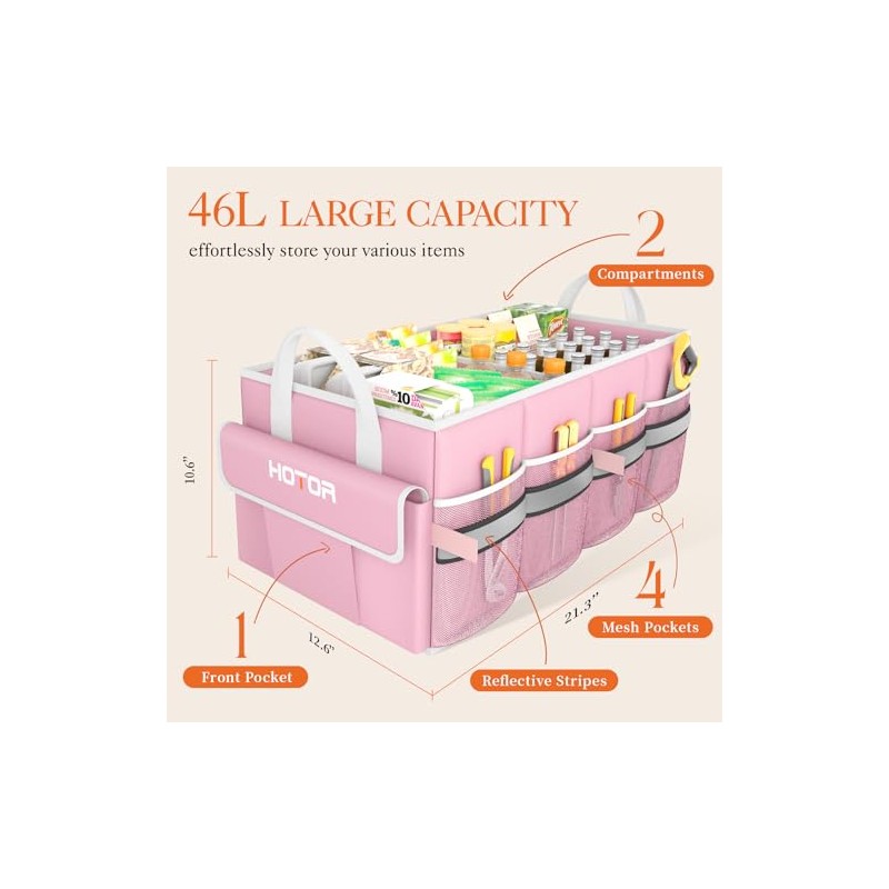 HOTOR Car Organizer, Foldable Trunk Organizer for SUV, Sedan & Van, Car Organization with Sturdy Base Panel, 2 Compartments, Pink, 21.3"×12.6"×10.6"