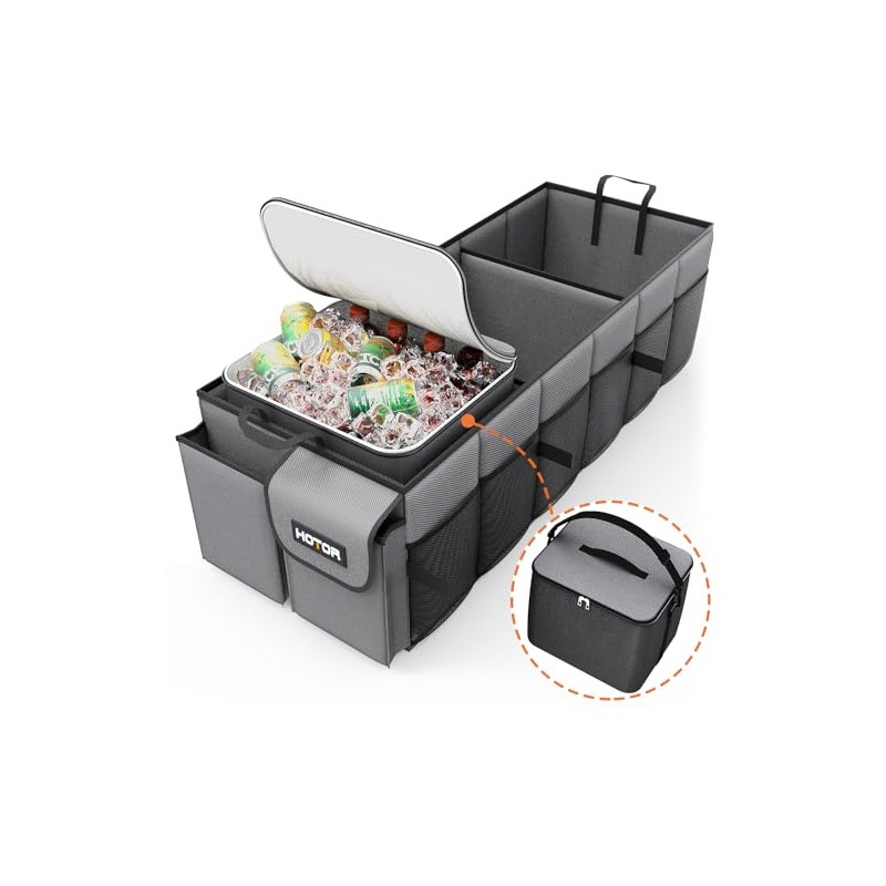 - DETACHABLE COOLER BAG: The HOTOR car storage organizer features an extra 23L cooler bag that is 100% leakproof, waterproof, and insulated, keeping drinks and foods cool or warm. Moreover, this car cooler for vehicles can be used separately or folded into the side pockets when not in use. It's perfect for trips, camping, picnics, or any outdoor adventure.