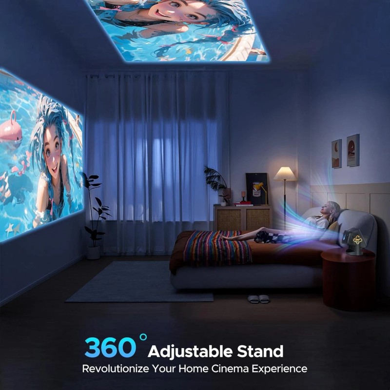 🤖🤖🤖【Built-in Bluetooth 5.3 and Stereo Speakers】The projector has an innovative 360° rotatable stand, allowing you to place the projector anywhere for projection - such as tables, stools, sofas and outdoor grass, etc. The PR07 projector has a native 720P resolution and supports 1080P decoding, and the high brightness provides you with vivid colors and clear images. Let you experience the best film and television effects of the projector whether indoors or outdoors