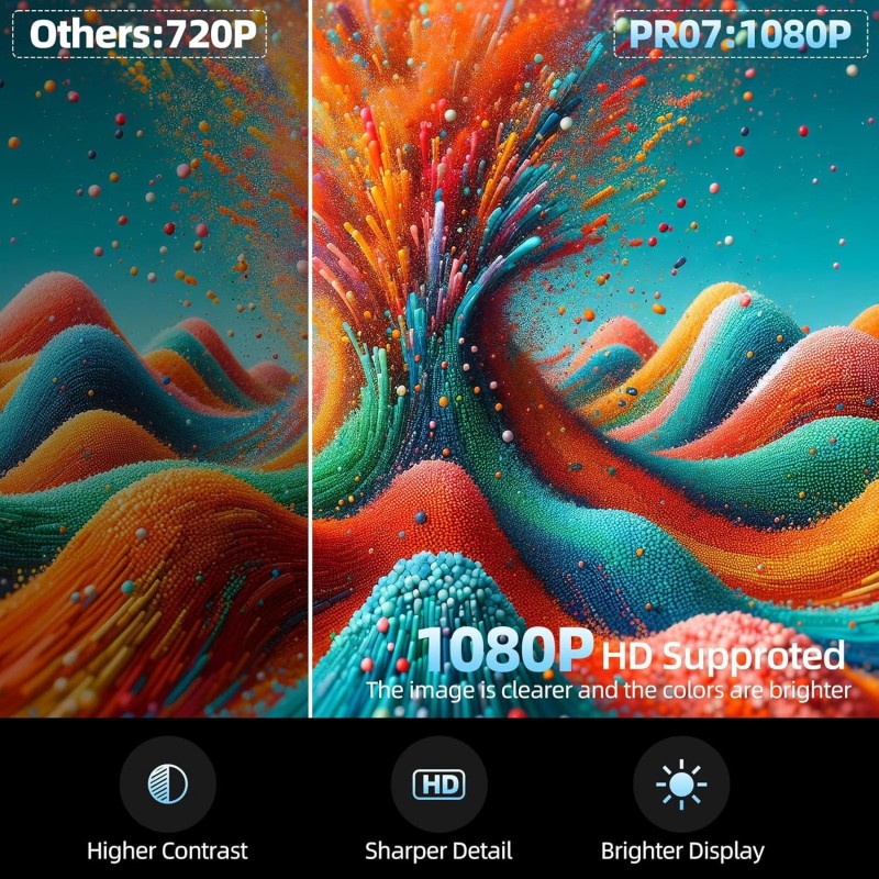 🌈🌈🌈【360° Adjustable Stand and Support HD 1080P Decoding】The projector has an innovative 360° rotatable stand, allowing you to place the projector anywhere for projection - such as tables, stools, sofas and outdoor grass, etc. The PR07 projector has a native 720P resolution and supports 1080P decoding, and the high brightness provides you with vivid colors and clear images. Let you experience the best film and television effects of the projector whether indoors or outdoors