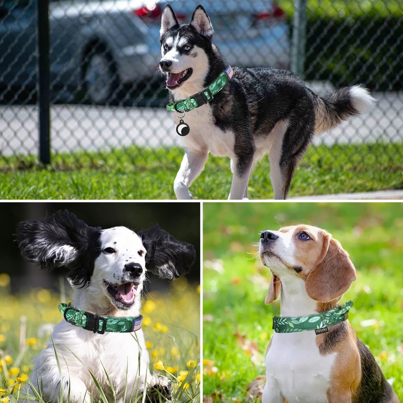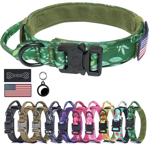 Hotsky Tactical Dog Collar, Adjustable Military Training Nylon Dog Collar for Medium Large Dogs, with Handle, Heavy Duty Metal Buckle, Airtag Case, 2 Patches, Spring, Green, M