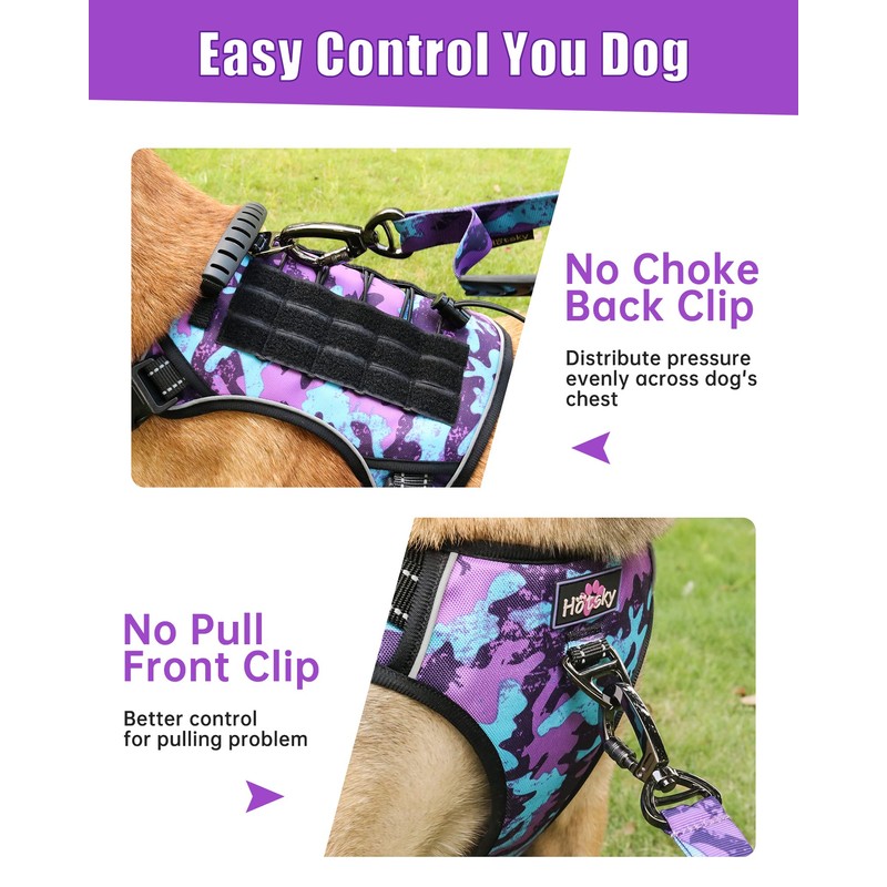 Hotsky Tactical Dog Harness for Large Dogs No Pull Adjustable Military Service Dog Vest Reflective Pet Harness with Control Handle Molle Loop Panels for Training Walking Running(Purple Camo, L)