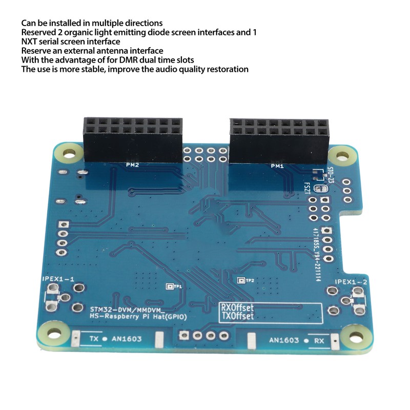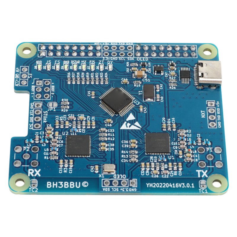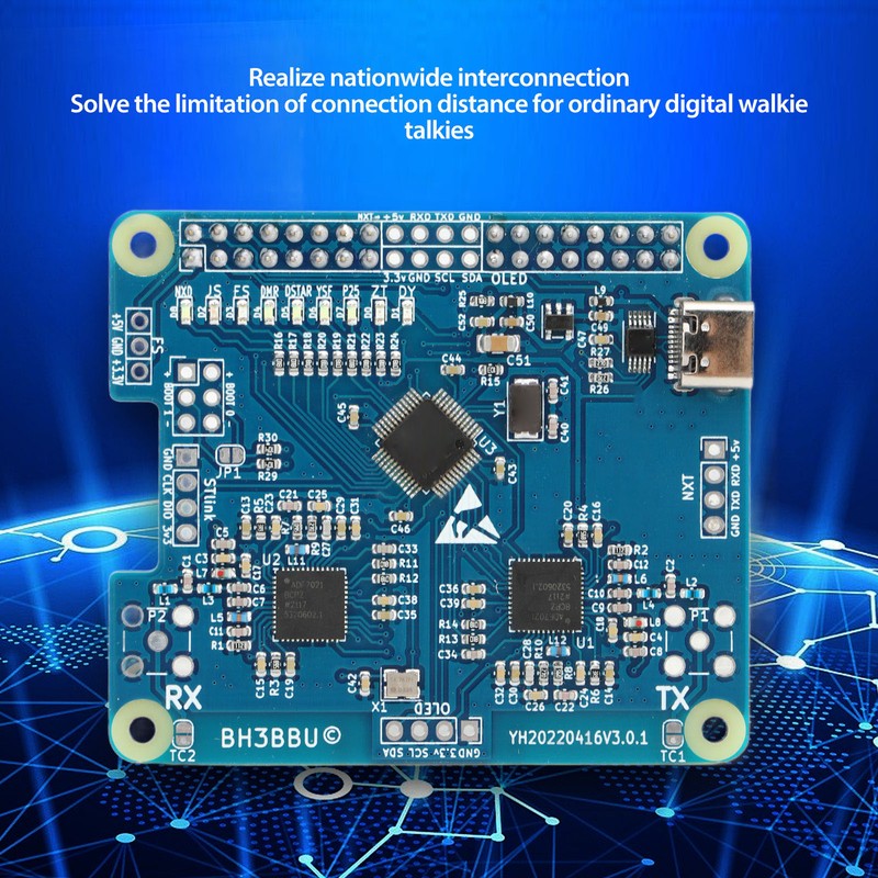 1、NATIONWIDE INTERCONNECTION: By using a duplex hotspot board to achieve nationwide interconnection, the limitation of the connection distance of ordinary digital walkie talkies has been solved. 2、HIGH STABILITY: The hotspot board adopts imported components and temperature compensated crystal oscillator, with stable long term startup performance and low bit error rate. 3、LOW HEAT: Hotspot module has the advantages of optimized wiring, perfect component layout, low heat generation, and fast heat dissipation, making it suitable for long term startup work. 4、MULTI INTERFACE: The board is reserved with 2 organic light emitting diode screen interfaces and 1 NXT serial screen interface, which can be installed in multiple directions to make the screen more personalized. Which also reserves an external antenna interface. 5、MULTI MODE: With the advantage of for DMR dual time slots. All debugging parameters are fine adjusted based on for DMR system, which is more stable in use and improves the audio quality restoration. For other systems, users can adjust the frequency offset slightly and use stably in for DMR, D Star, YSF (C4FM), P25, NXDN, POCSAG and other modes.