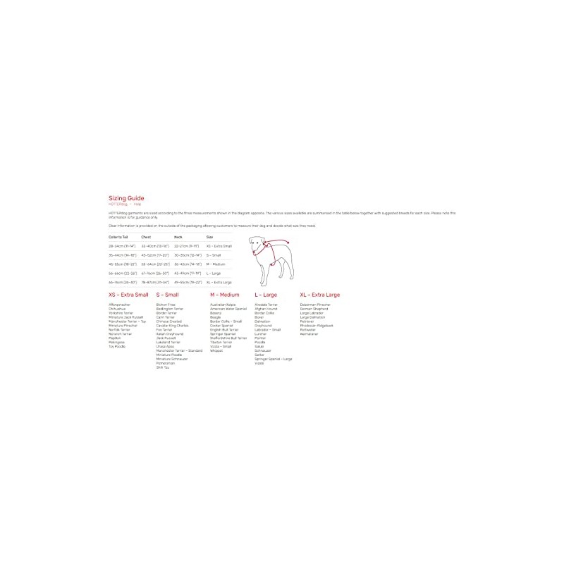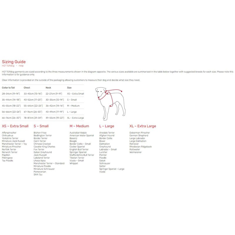 - HOTTERdog garments are sized according to the three measurements: Size Small = Collar to Tail: 35–44cm (14–18"), Chest: 43–52cm (17–20"), Neck: 30–35cm (12–14")
