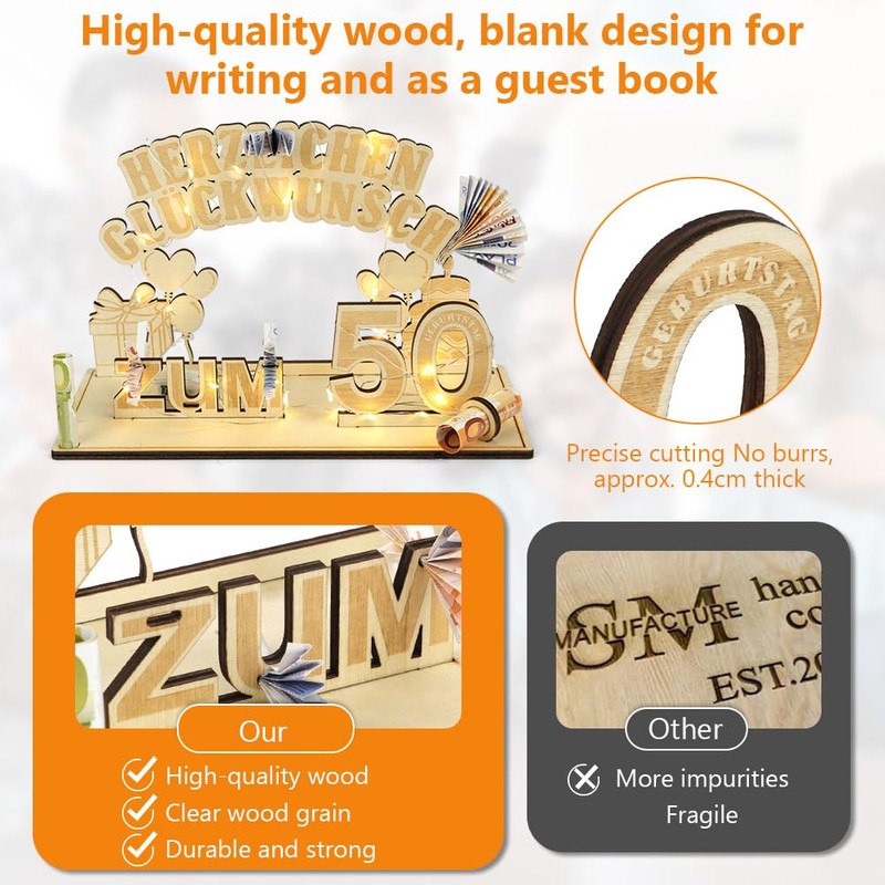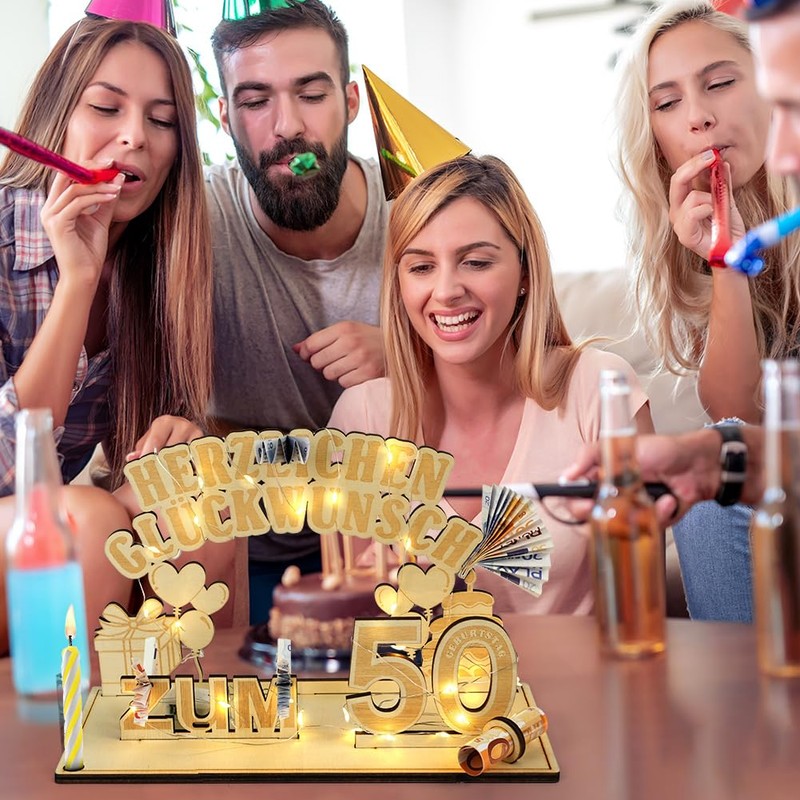 HOTUT Holz Schild Gästebuch, 50 Geburtstag Geschenk Frauen & Männer, Geldgeschenke Geburtstag 50 mit LED Lichterkette Ständer, 50 Geburtstag Jubiläum, Geburtstag Deko, Personalisierbares Geschenk