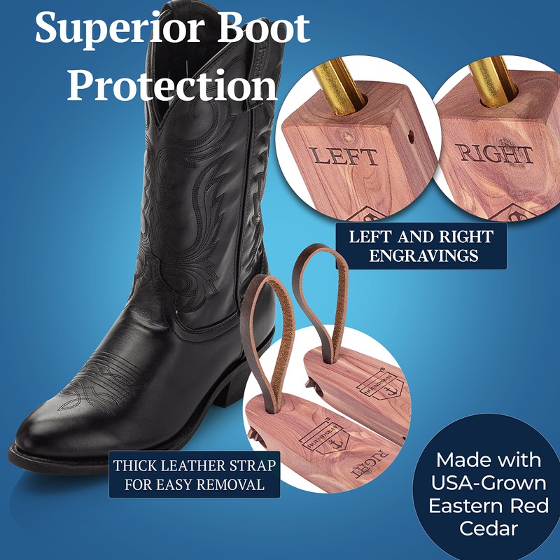 - American Grown Top Quality - We use the very best American grown shoe tree cedar in our cedar boot trees for men. Our cedar will absorb moisture from the leather to preserve and extend the life of your favorite pair of cowboy boots.