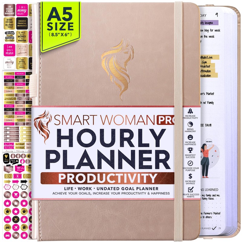 Hourly Planner - Undated Weekly & Monthly Life Planner, 12 Month Journey to Increase Productivity & Happiness, Gratitude Journal, Financial Planner, Self Care Journal for Women - Vertical Layout