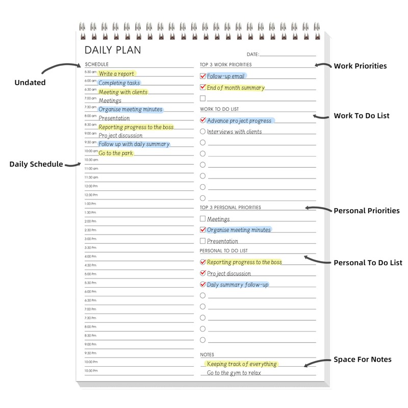 • PLANNING AHEAD FOR GREATER EFFICIENCY - Each plan page contains half-hour schedule, work & personal priorities, work & personal to do list, notes. Write down your thoughts, goals, and ideas so you can easily get started at any time!