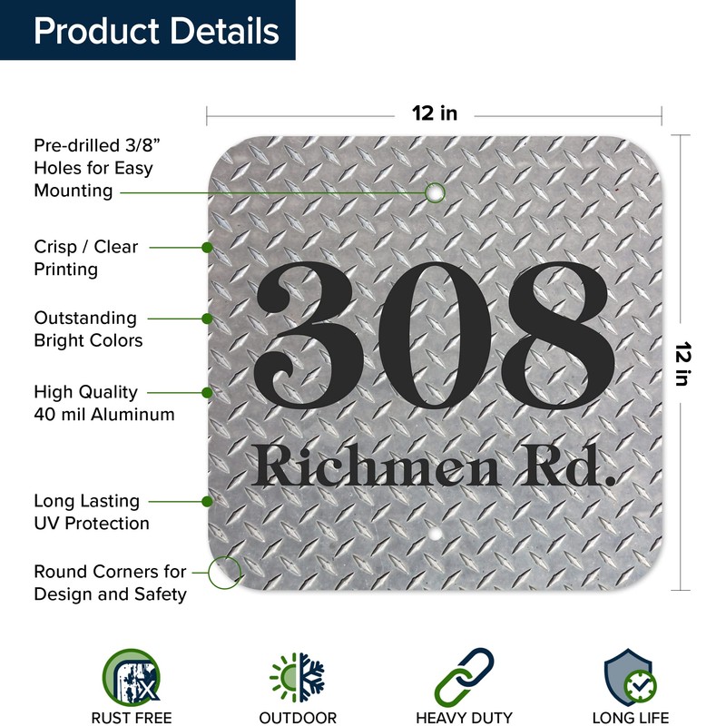 House Address Sign, House Number Plaque, 12x12, .040 Aluminum, 20 Font Styles, Reflective Option, USA Made by My Sign Center (Square - Diamond Metal)