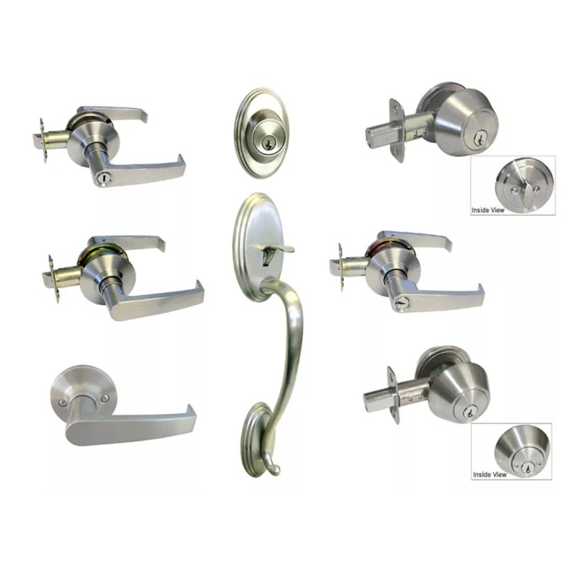 Those Satin Nickel Levers - Handicap Friendly Lever have entrance, privacy, passage, dummy, front door handleset, front door dummy handleset, single deadbolt, and double deadbolt.